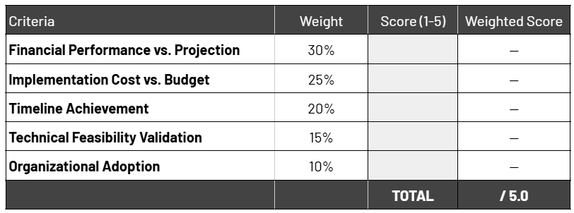 CFOs need a systematic approach to evaluate AI experiment performance against projections. This scorecard provides weighted criteria to make objective scale/kill/modify decisions based on financial and operational results.