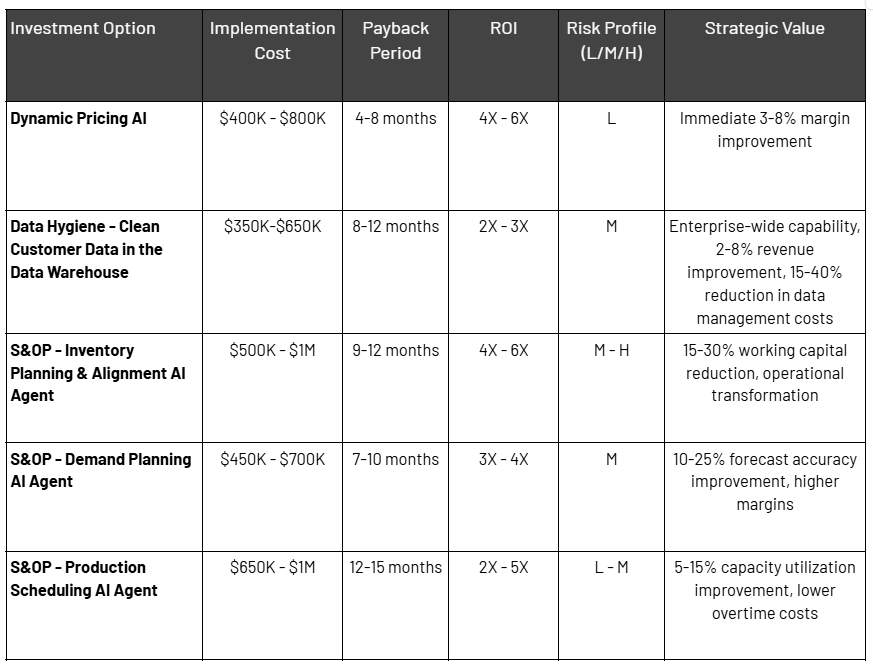 - Start with: Dynamic Pricing AI ($400K-$800K) – Immediate margin impact with low risk and fast payback