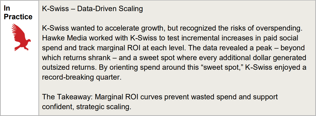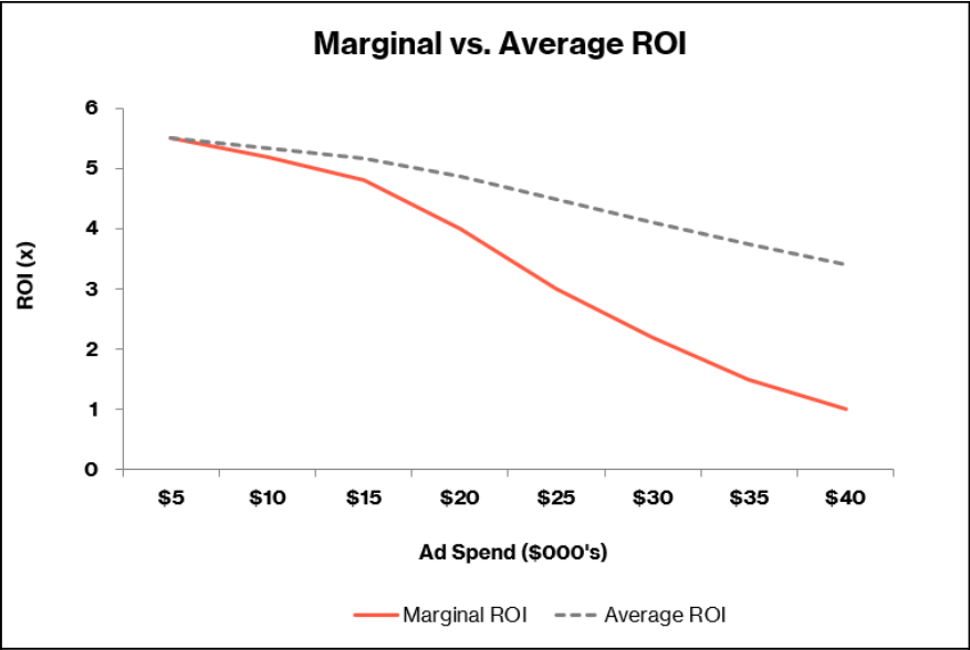 This is where understanding marginal ROI is important. Marginal ROI looks at the return on the next dollar spent, not just the average return on all dollars spent. Without insight into marginal ROI, you’re flying blind when it comes to scaling your budget. A campaign that looks profitable at $10,000 in spend may become less efficient at $50,000 – or vice versa.