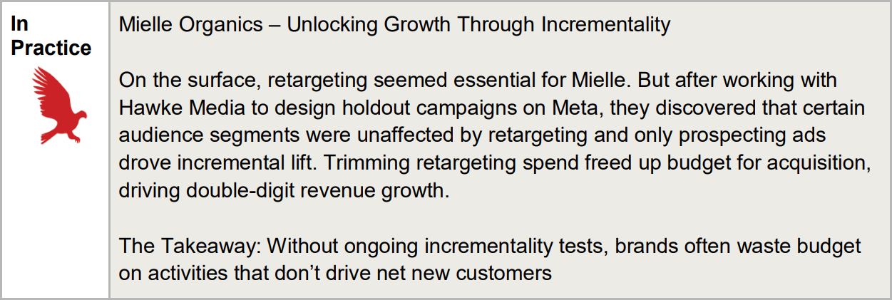 Sophisticated performance marketers pair attribution models with incrementality testing to avoid false signals. Just because a channel touches a lot of conversions doesn’t mean it’s driving them. Incrementality testing helps you separate correlation from causation – and spend more efficiently as a result.