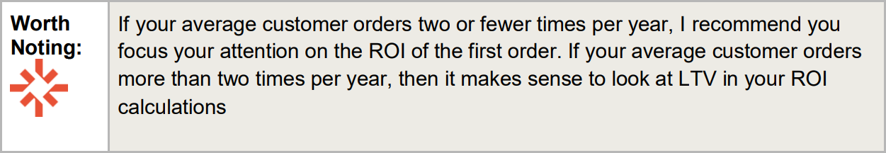 This leads to an important concept that we’ll explore in the next article: breakeven ROI – the point at which a customer’s cumulative contribution profit equals the cost to acquire them. For some businesses, this breakeven happens on the first order. For others, it may take two, three, or more repeat purchases. In the next article, we’ll dig deeper into how to calculate breakeven ROI and why understanding customer payback periods is essential to planning your marketing strategy and managing cash flow as you scale.