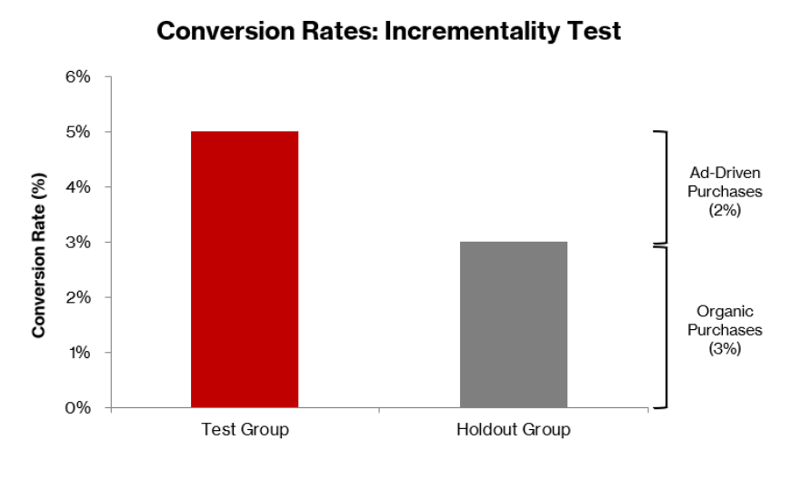 Let’s say you run a campaign and find that 5% of the test group made a purchase, while 3% of the holdout group made a purchase without seeing the ad. The incremental lift is 2 percentage points – meaning only 40% of the observed purchases in the test group (2 out of 5) were truly driven by the ad. That means only 40% of the associated revenue should be attributed to your ad spend when calculating ROI. The other 60% would have happened anyway.