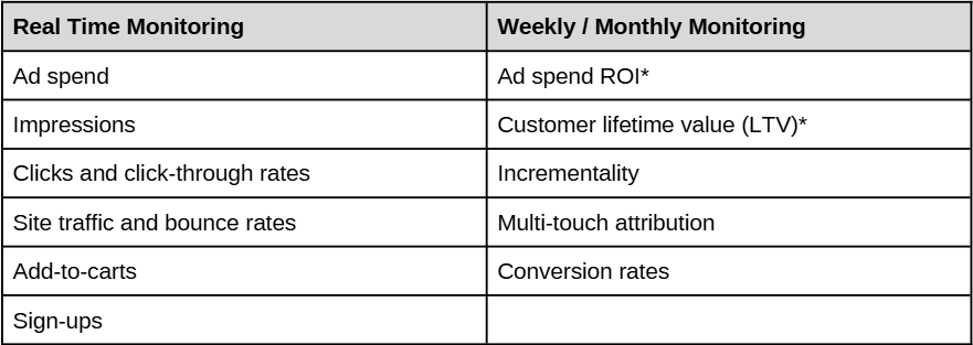 Because of these constraints, most companies adopt a tiered approach. They track top-of-funnel signals like impressions, spend, traffic, and early conversion proxies (e.g., add-to-cart events) in real time to spot trends or detect issues quickly. But they wait for more complete data before drawing conclusions about conversion and ad spend ROI. Evaluating return on ad spend weekly and monthly strikes a good balance between speed and reliability.